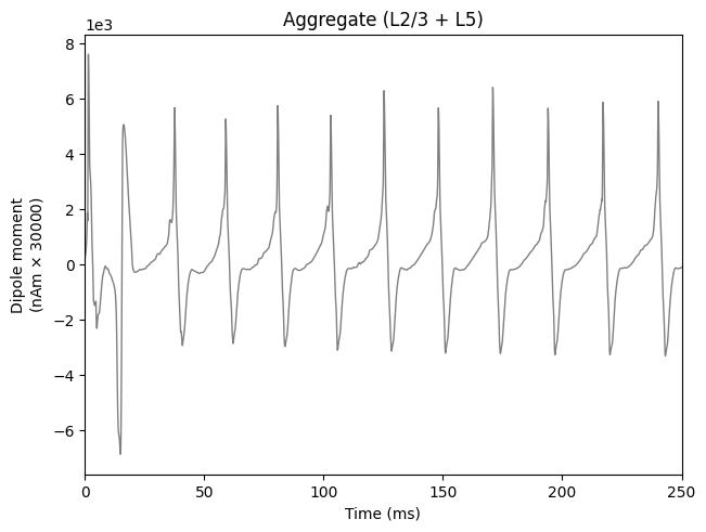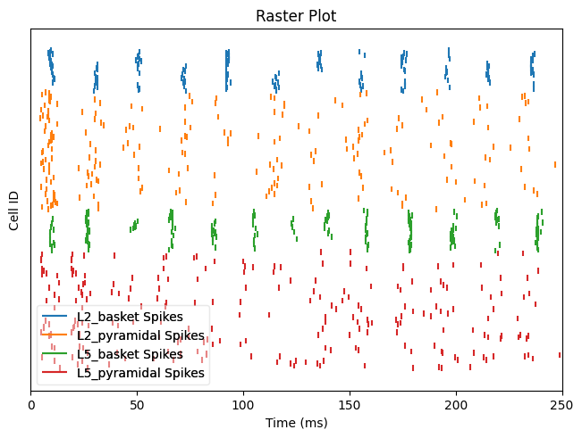 Now, let us try to re-run the simulation with a tonic bias applied to the L5 Pyramidal cells. Notice that the oscillation waveform is more regular, with less noise due to the fact that the tonic depolarization dominates over the influence of the Poisson drive. By default, a tonic bias is applied to the entire duration of the simulation.