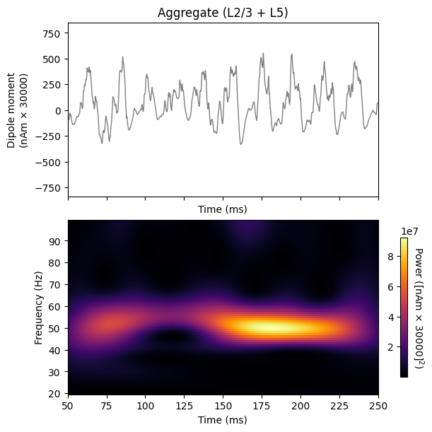 To confirm that the periodicity observed in the firing patterns correspond to a population oscillation in the gamma-range, we can plot the time-frequency representation together with the signal. Note that the network requires some time to reach steady state. Hence, we omit the first 50 ms in our analysis.