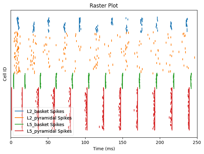 Take a look at how different cell types respond to the exogenous drive. Note the periodic firing pattern of all cell types. While the basket cells fire relatively synchronously, the pyramidal cell populations display a more varied pattern, in which only a fraction of cells reach firing threshold.