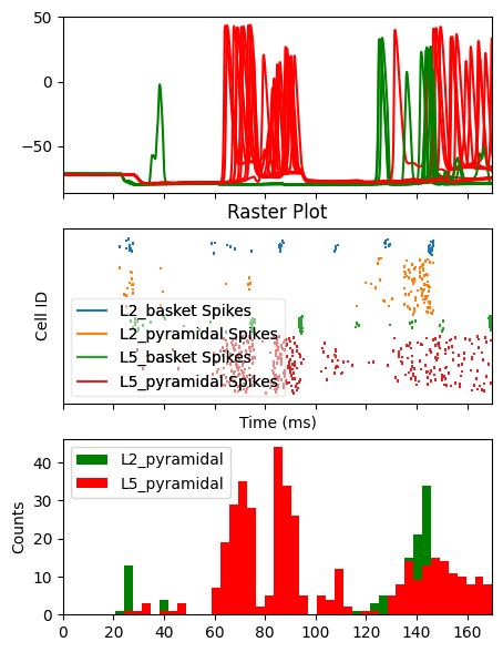 Finally, we can plot the soma voltage along with the spiking activity with raster plots and histograms for the pyramidal cells.
