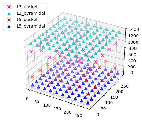 Extracellular recordings require specifying the electrode positions. It can be useful to visualize the cells of the network to decide on the placement of each electrode.