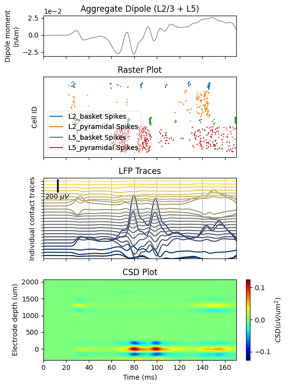 The main output of HNN simulations is the 'dipole' waveform, i.e., the net intracellular current flowing in pyramidal cell apical dendrites. At the large distances between cells and M/EEG sensors, this 'primary' current is the main contributor to the measured fields. Close to the cells, the local field potential (LFP) is the result of intracellular current leaking into the extracellular medium through active and passive membrane channels. Under some simplifying assumptions, we may approximate the LFP at virtual electrodes placed in and around the HNN network model.