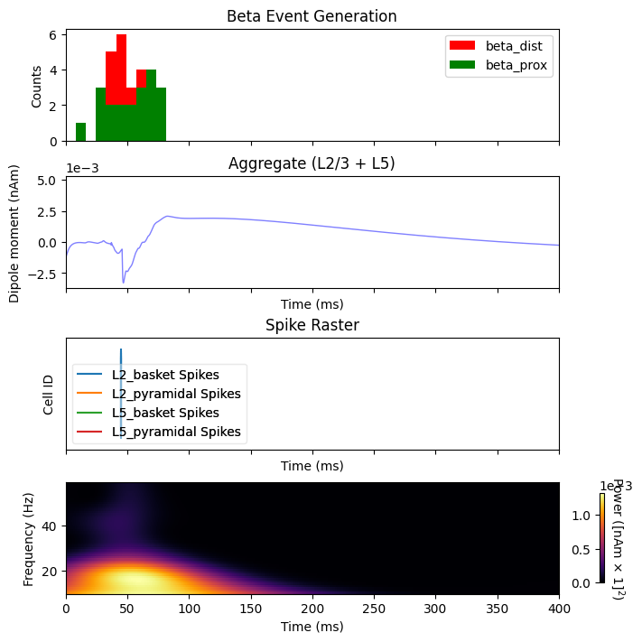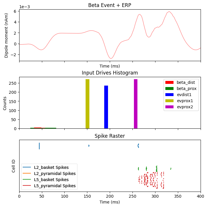 And finally we simulate. Note that the default simulation time has been increased to 400 ms to observe the long time course over which beta events can influence sensory input to the cortical column.