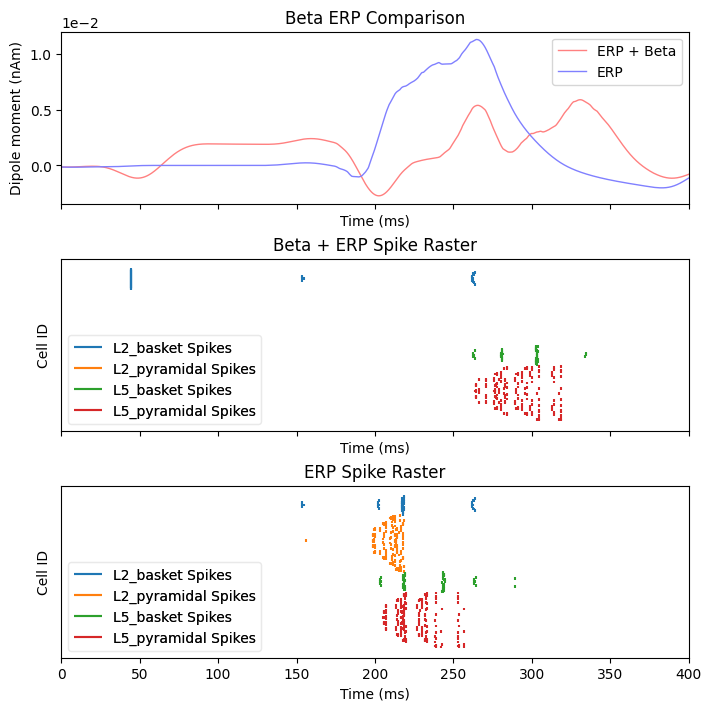 This example demonstrates how event related potentials (ERP) are modulated by prestimulus beta events. Specifically, this example reproduces Figure 5 from (Law et al. 2021). To be consistent with the publication, the default network connectivity is altered. These modifications demonstrate a potential mechanism by which transient beta activity in the neocortex can suppress the perceptibility of sensory input. This suppression depends on the timing of the beta event, and the incoming sensory information.